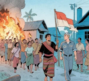 Namun Abun hanya memalingkan wajah, menahan kesal. “Aku tidak mau tahu. Aku tidak peduli dengan kata ‘nasionalisme’ yang Ayah banggakan itu!” katanya lalu berlari ke kamarnya, membanting pintu keras-keras.
