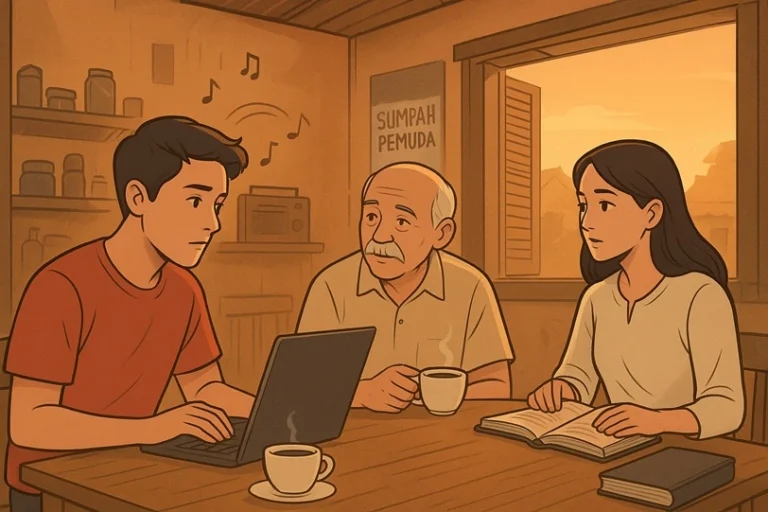 Ruangan hening. Aku menatap layar yang menampilkan gambar para pemuda 1928 itu. “Mereka tidak memegang senjata, tapi kata-kata mereka lebih tajam dari baja. Mereka tidak hanya bermimpi, tapi berjanji—pada tanah air dan satu sama lain.”