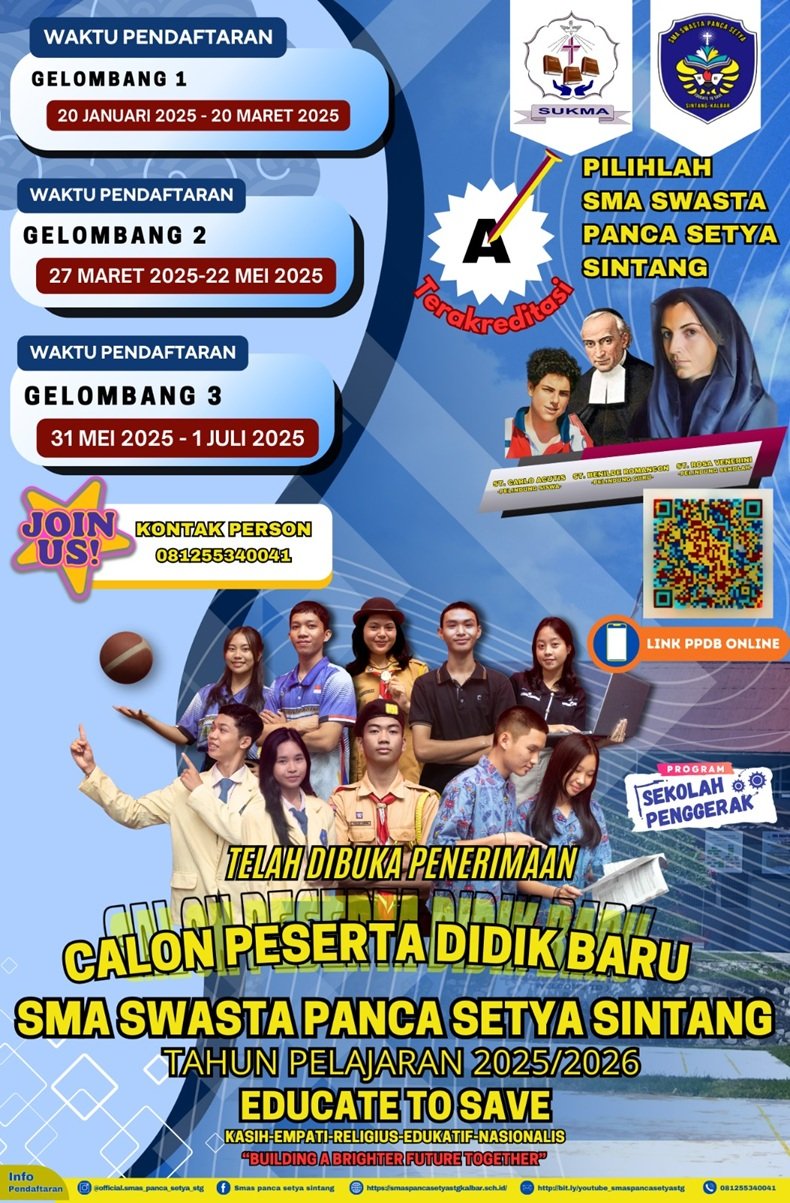 Sintang, Redaksi Sanrosven– SMA Swasta (SMAS) Panca Setya Sintang kembali membuka Penerimaan Calon Peserta Didik Baru (PCPDB) Tahun Ajaran 2025/2026. Dengan semangat Educate to Save dan nilai inti sekolah Kasih, Empati, Religius, Edukatif, Nasionalis (KEREN), sekolah ini siap melahirkan generasi unggul yang berkarakter, berprestasi, dan berdaya saing global.